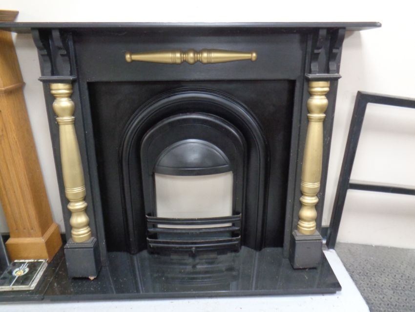 A Victorian style cast iron fire insert with painted surround and black marble hearth.