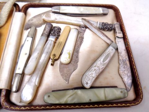 A small collection of assorted pocket knives to include a silver mother of pearl handled fruit knife and further mother of pearl knife handles.