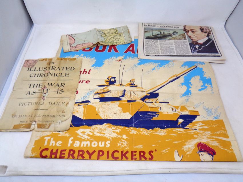 A box and a case containing sheet music, Alba radio, one-man band wash boards, a Prince Albert's own 11th hussars poster, one volume the illustrated chronicle The wall