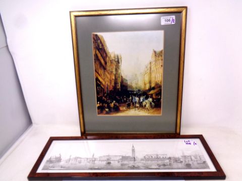 After Thomas Miles Richardson Snr. (1784 - 1848) : Procession of the High Sheriff of Northumberland Going to Meet the Judges, 1835, reproduction in colours, 25 cm x 20 cm, together with a monochrome print after Antonio Berselli depicting a panoramic view of The Grand Canal, Venice, both parts framed. (2)