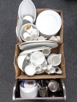 Two boxes containing white ceramic kitchen ware to include John Lewis, Thomas Wedgwood etc together with a bread bin containing stainless steel teapot and jug