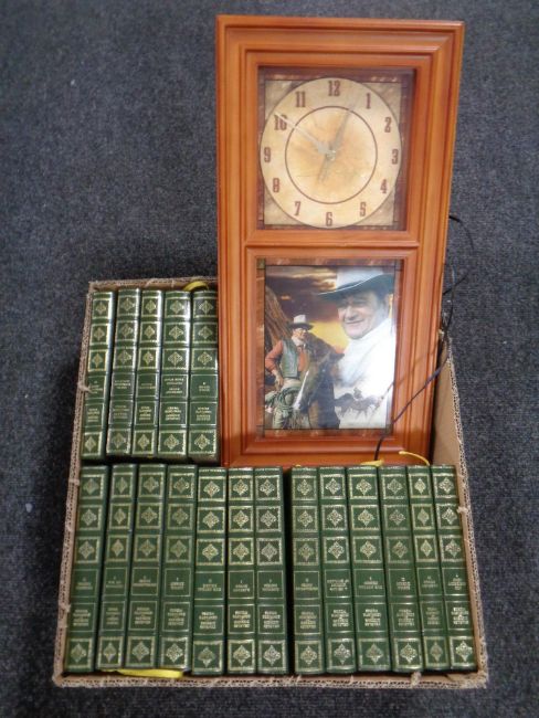 A box containing eighteen leather bound Heron Press Charles Dickens volumes together with a John Wayne wall clock and a wooden model of a pond yacht