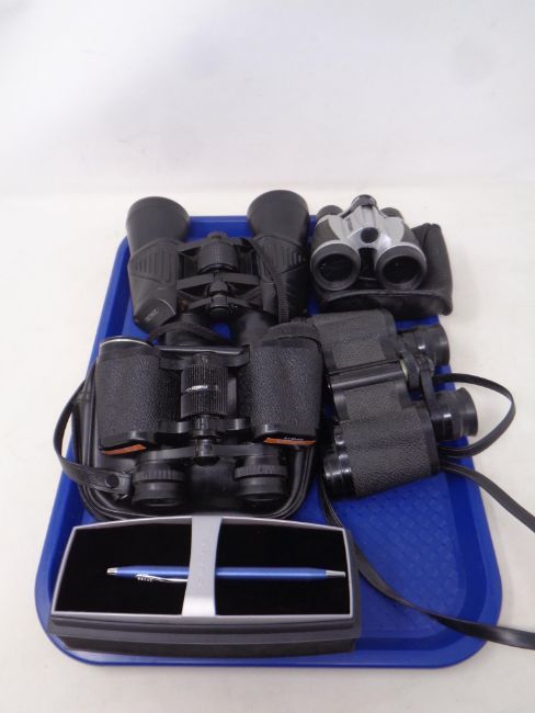 A tray containing a boxed Cross pen together with four sets of field glasses