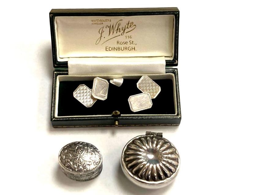A pair of silver cufflinks and two silver boxes