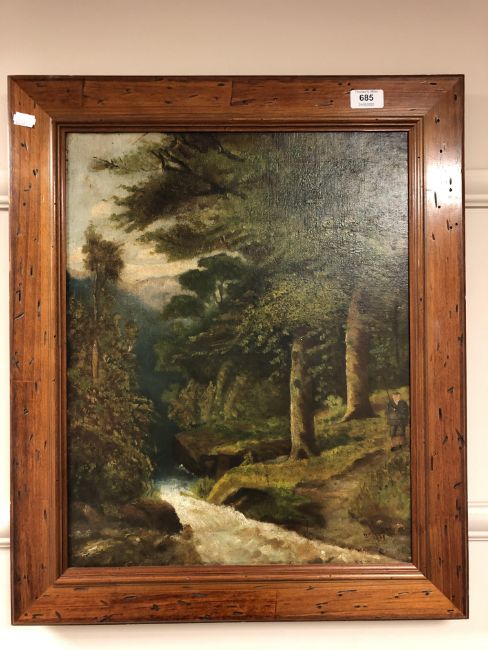 Nineteenth Century School : Wooded River Landscape, oil on canvas, indistinctly signed, 50 cm x 40 cm, framed.