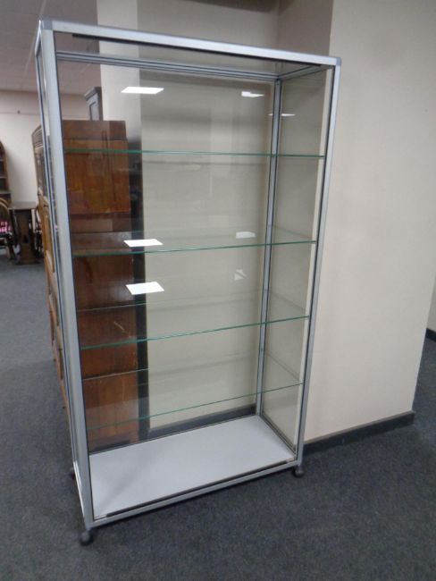 A contemporary metal and glass display cabinet fitted four glass shelves internally