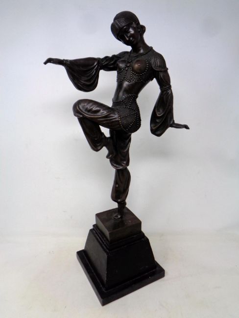 An after Chiparus bronze sculpture of an Art Deco dancer on a black marble base. Height 49 cm