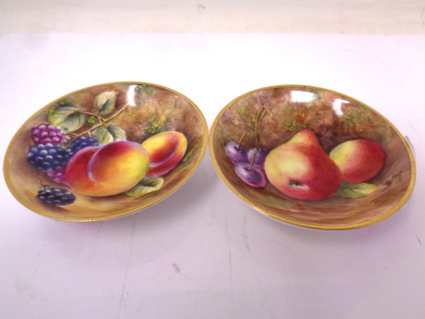 Two Royal Worcester gilt-rimmed small circular dishes, with hand painted Fruit decoration, each indistinctly signed (different artists), diameter of each 7 cm. (2)