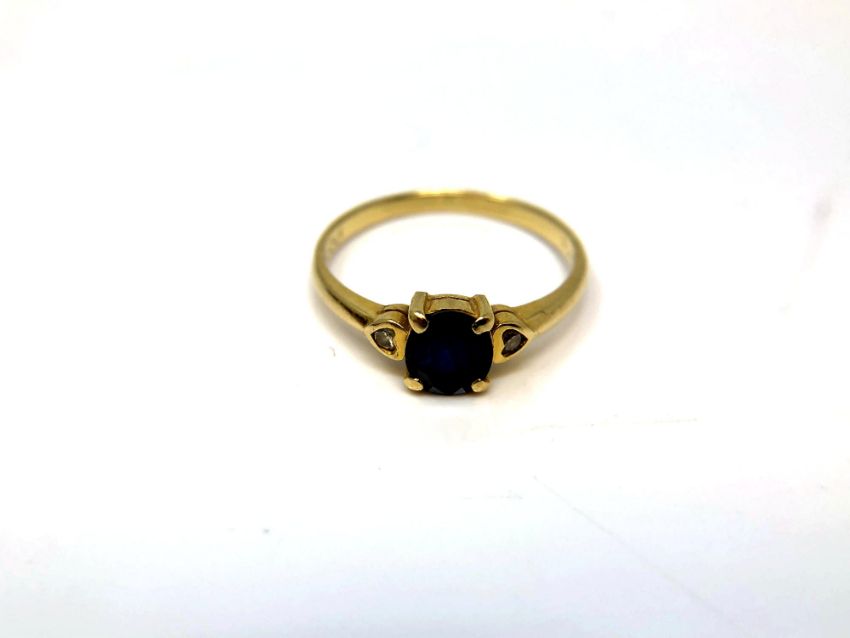 An 18ct yellow gold sapphire and two stone diamond ring, size M/N, 2.1g.