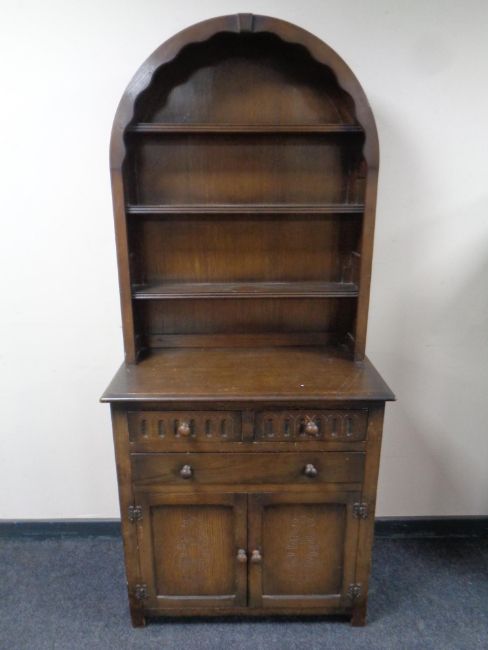 An oak dome topped dresser fitted cupboards and drawers beneath