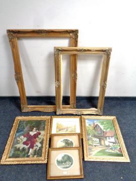 Two gilt picture frames together with two gilt framed tapestries and a further two gilt framed pictures