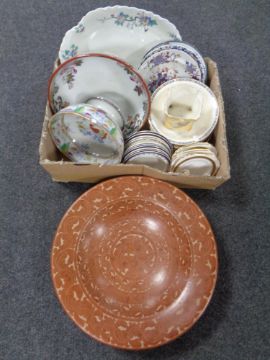 A box containing a large quantity of antique and later ceramic bowls, meat plates, dinner ware, desert sets, Royal Tuscan saucers together with a large middle eastern style bowl
