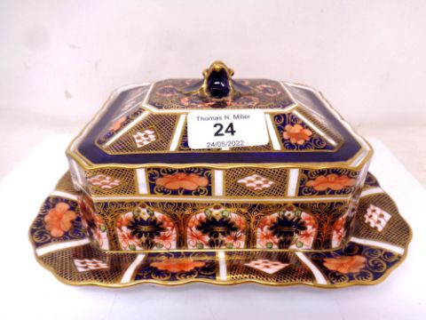 A Royal Crown Derby Imari pattern lidded rectangular dish, on a fixed scallop-edged base, dimensions 21 cm x 18 cm x 7 cm.