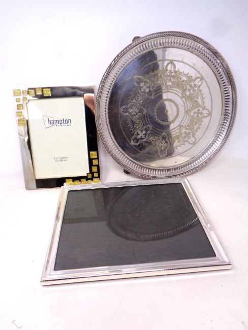 A silver plated pierced rim salver together with 2 photograph frames.