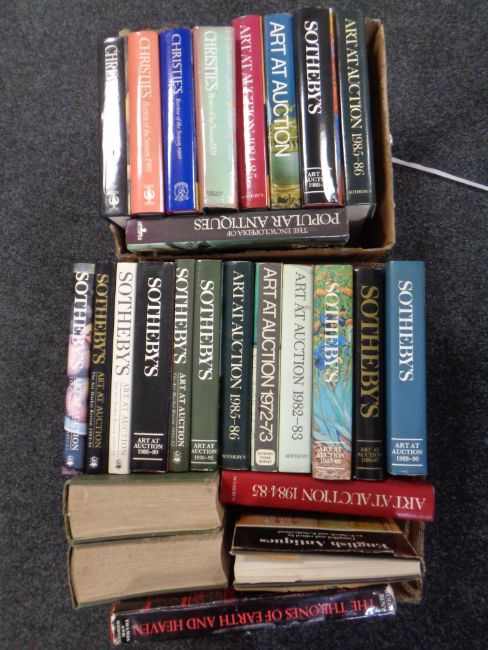 Two boxes of a quantity of Christies and Sothebys art auction catalogues together with further volumes relating to antiques