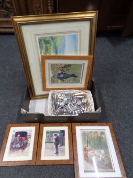 A box containing basket containing stainless steel cutlery, four Lawson Wood prints in frames and mounts together with a further framed print.