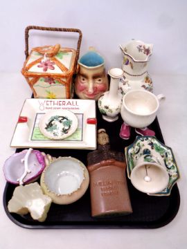 A tray of assorted ceramics to include Mason's Chartreuse, Denby stoneware William IV decanter, Carlton ware teacup etc