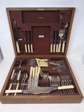 An Edwardian oak canteen of silver plated and stainless steel cutlery.