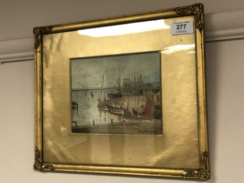 Stanley Brinton : Fishing Boats Moored by a Jetty, signed, dated 1918, 14 cm x 17 cm, framed.