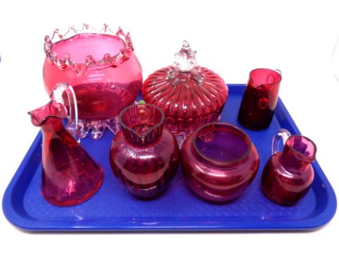 A tray containing seven pieces of antique cranberry glassware to include lidded pot, vase, jugs etc (7)