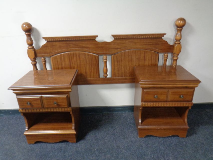 A six piece American style bedroom suite comprising two four-drawer chests, pair of bedside stands, three drawer dressing table and a 5' headboard