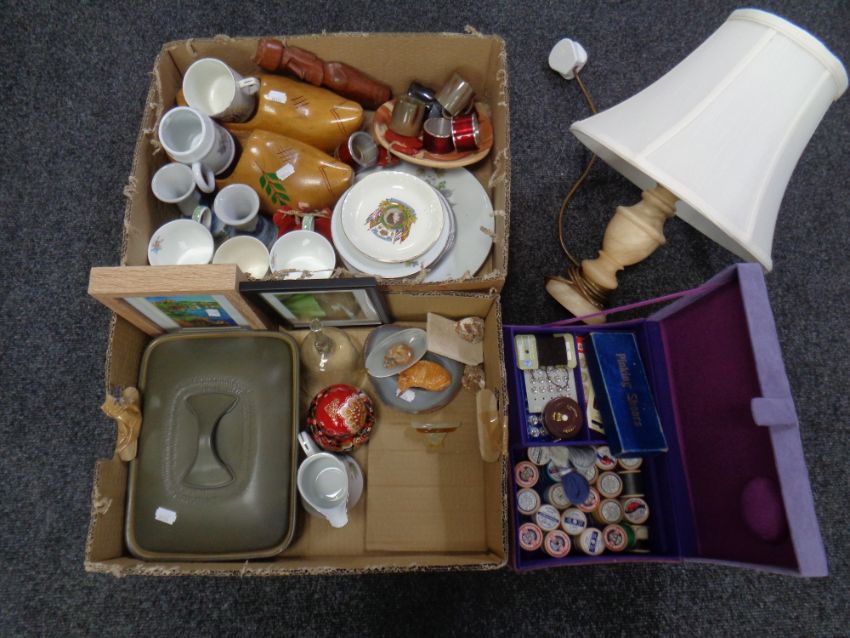 Two boxes of assorted ceramics, wooden clogs, Denby lidded tureen, sewing kit, table lamp and shade, Russian dolls, etc