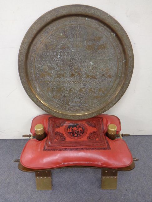An Eastern brass tray and a camel stool