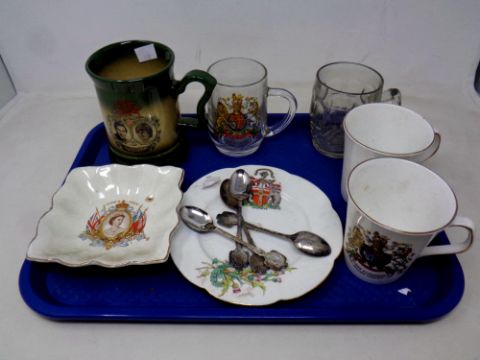 A tray of Royal Family commemorative china, mugs, tankards, shallow bowl, four souvenir spoons