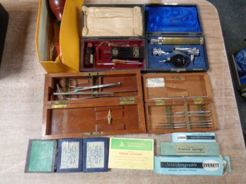 A tray of assorted cased medical instruments, Everett syringes, hypodermic needles, stainless steel serum needles etc