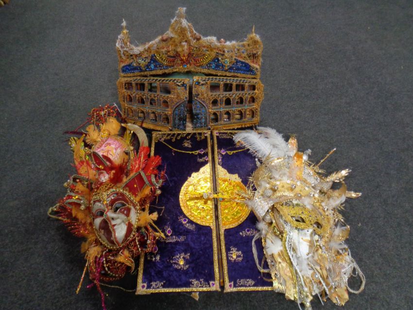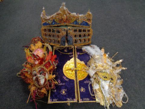 Two hand made Venetian masks, a wall cabinet and a theatre building (4)