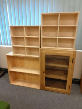 An antique pine glazed door wall cabinet and three sets of open shelves