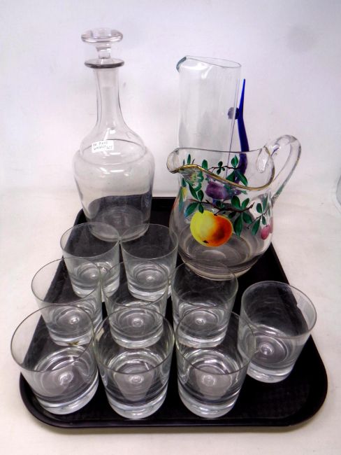 A tray of assorted glass ware - whiskey decanter, nine whiskey glasses, hand painted & etched glass jug