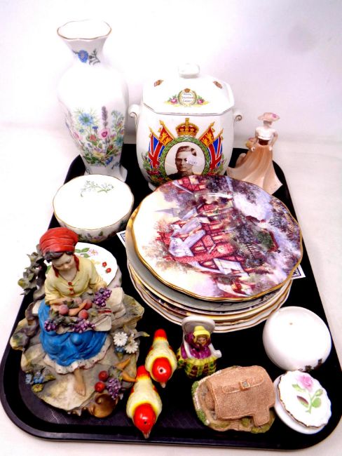 A tray of assorted antique and later ceramics to include coronation caddy, Aynsley Wild Tudor and Wedgwood Wild Strawberry cabinet china, trinket dishes, cabinet plates etc