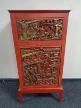 A painted Chinese style cabinet with gilt panel door on raised legs