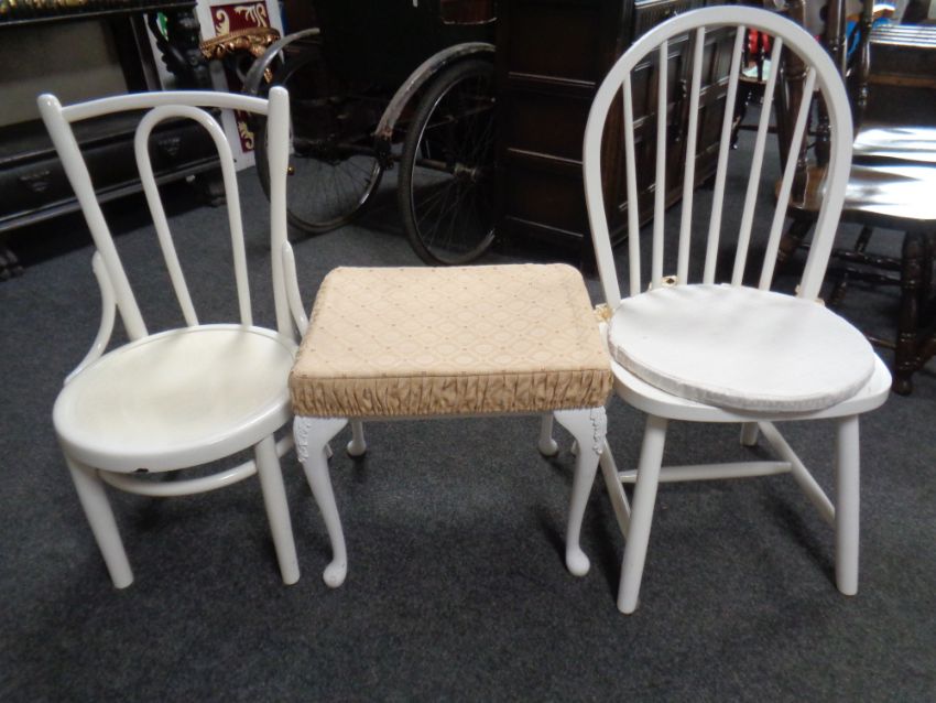 A painted kitchen chair, painted Bentwood chair and a dressing table stool
