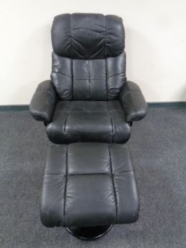 A black leather manual reclining swivel armchair with matching footstool