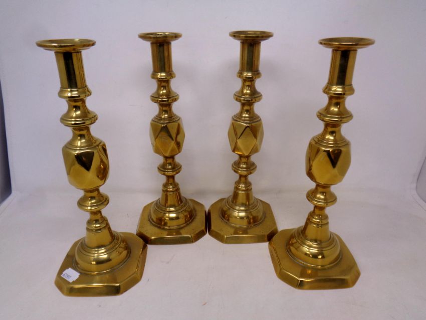 A set of four 19th century Queen of Diamonds brass candlesticks