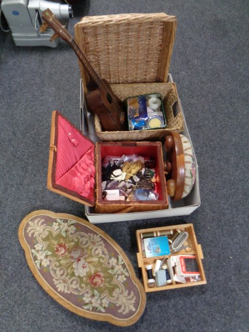 A box of wicker sewing boxes, tapestry upholstered stool and Victorian tray, miniature ukulele, etc