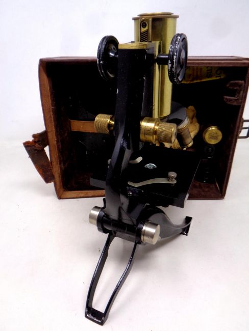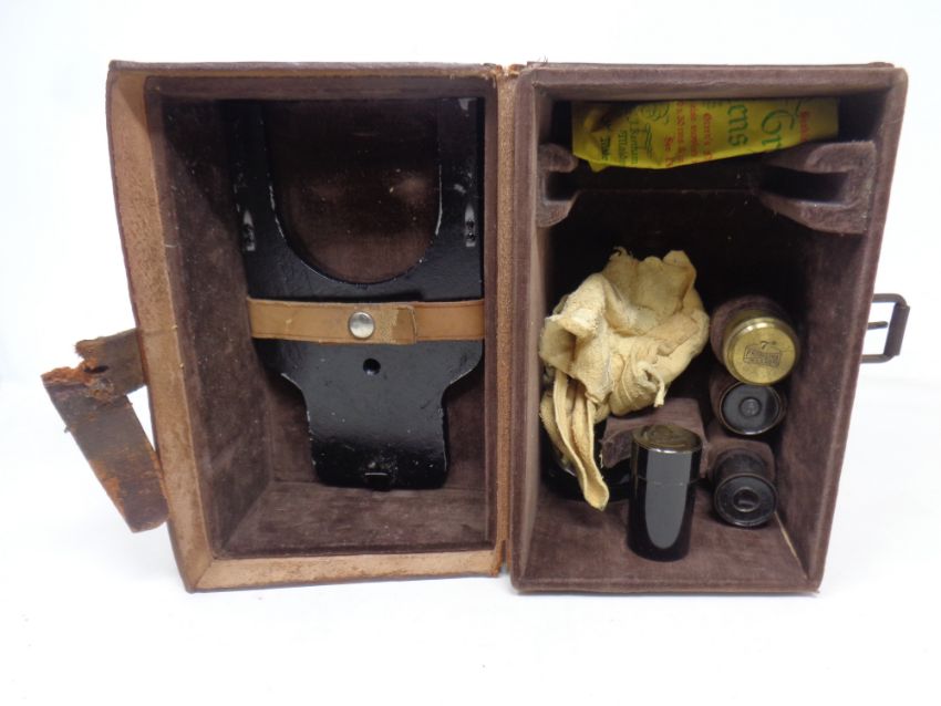 An early 20th century F Koristka of Milano brass and black lacquered microscope number 33275, in a fitted leather case with lens