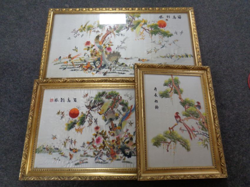 Three gilt framed Chinese needlework pictures on silk, depicting birds in trees