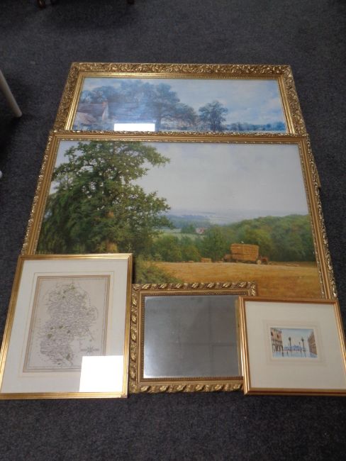 After John Constable : print, The Hay Wain in gilt frame, another gilt framed print, framed map of Bedfordshire, mirror, watercolour study of Venice