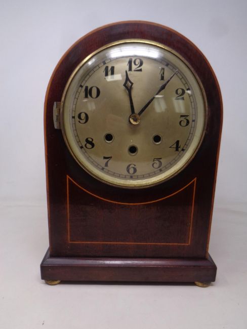 An Edwardian inlaid mahogany bracket clock with silvered dial