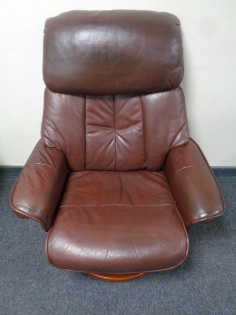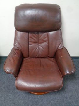 A wood framed brown leather manual reclining swivel armchair and similar footstool