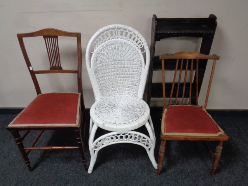 Two Edwardian bedroom chairs together with a set of open bookshelves and a painted wicker occasional chair