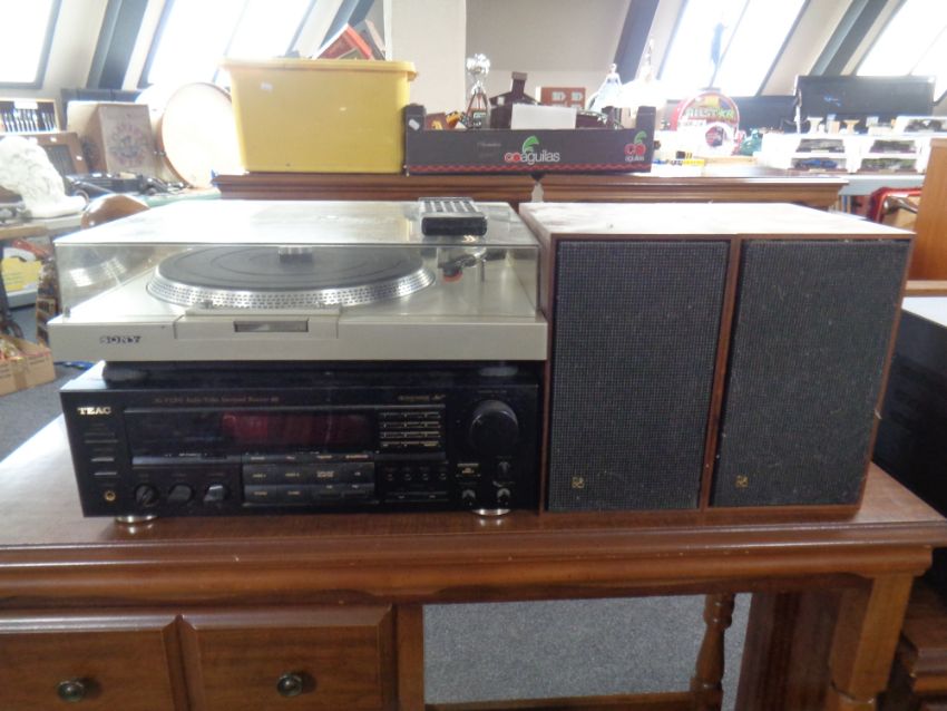 A Sony PS-T1 direct drive turntable, TEAC AG-V1200 surround receiver and a pair of vintage teak cased Bang & Olufsen Beo Vox 2200 speakers (continental wiring)