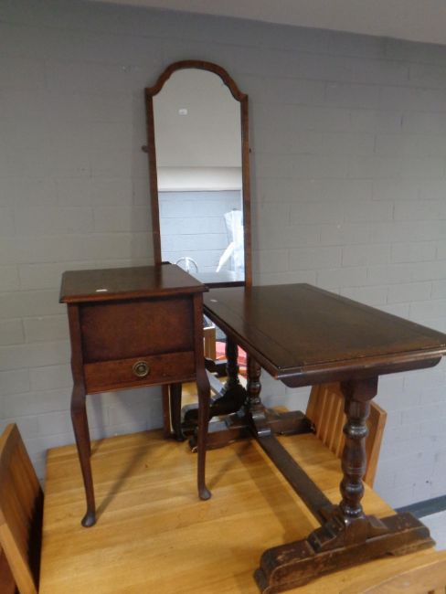 An oak sewing table on cabriole legs together with a refectory coffee table and mahogany framed hall mirror