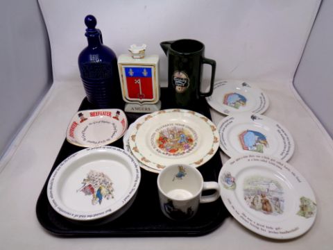 A tray containing assorted ceramics to include Wedgwood Peter Rabbit baby bowls, plates and cups, brewery items to include wade Beefeater shallow dish, Royal Doulton seagers ceramic gin decanter, continental angers decanter etc