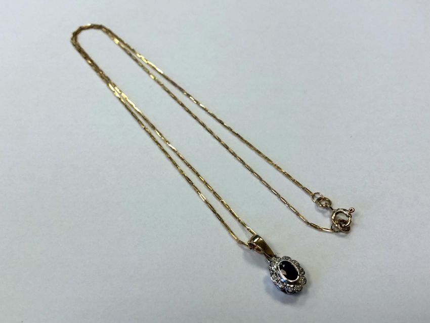 A 9ct gold diamond and garnet cluster pendant on chain
