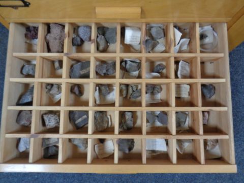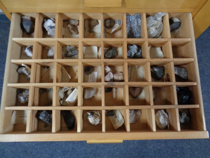 A good quality eight drawer glass topped collector's chest containing a large quantity of assorted rock crystals, fossils etc, height 91 cm with key.