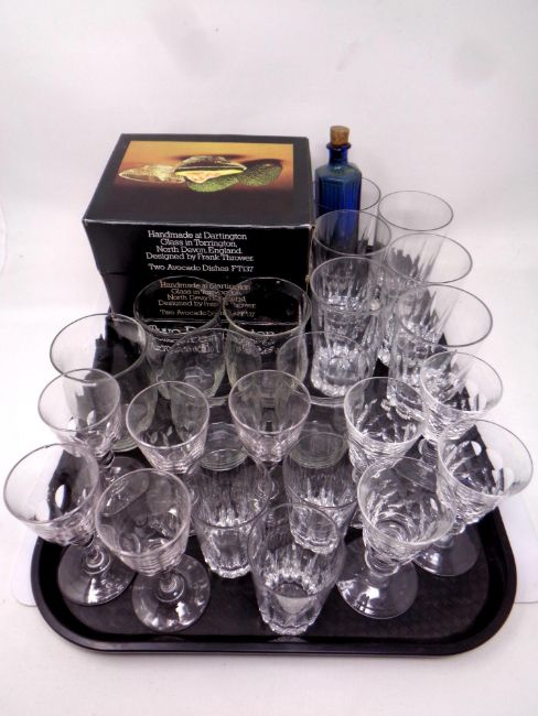 A tray containing antique and later glassware to include blue glass chemists bottle, liqueur glasses, tumblers together with three boxed pairs of Dartington avocado dishes.